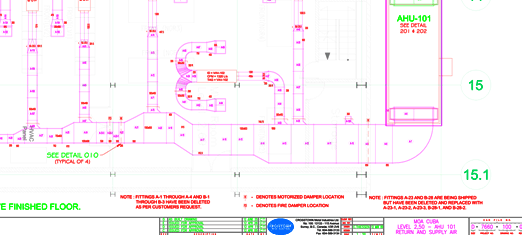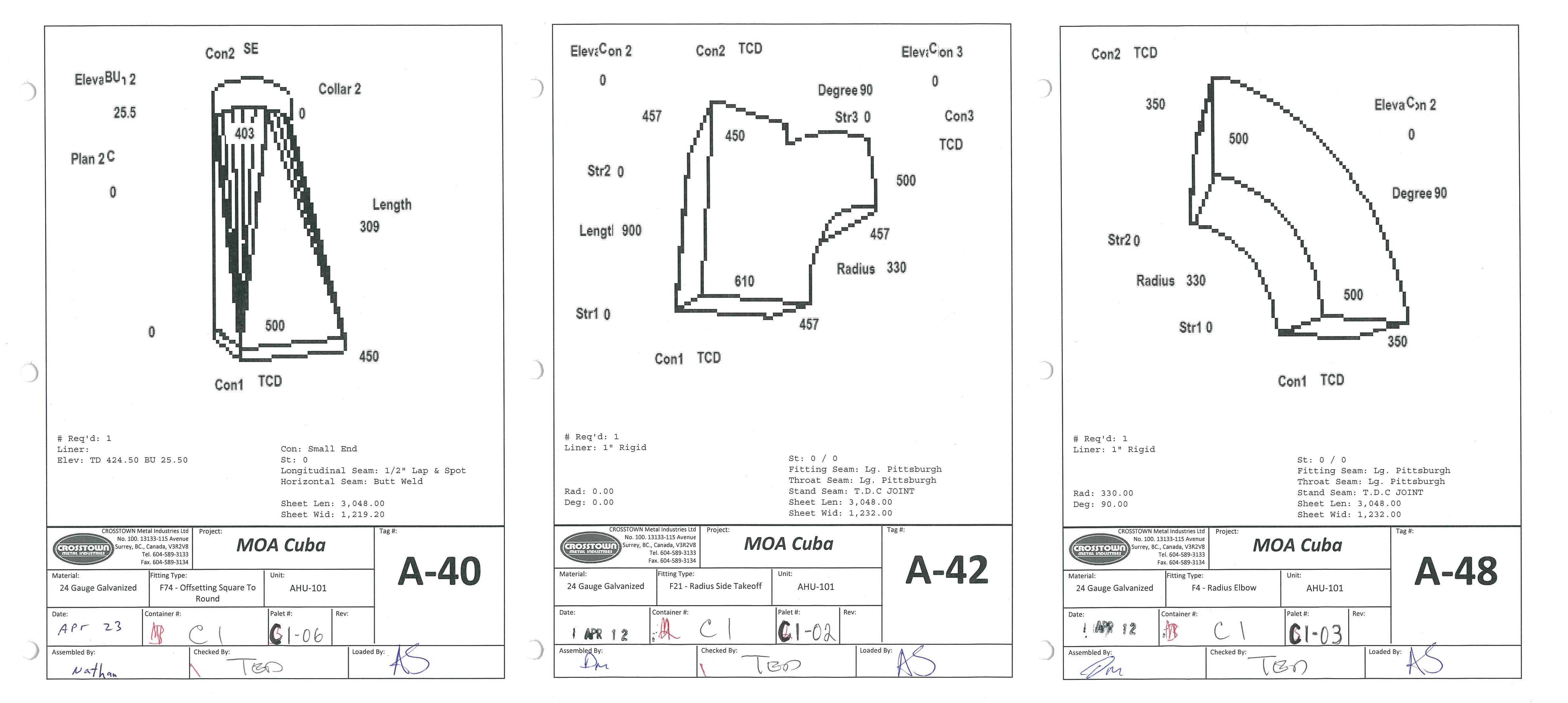 This HVAC system was first drawn in 3D and inserted into the customer's federated model to ensure there would be no interference with other trades. The 3D fittings were then laid out in 2D and sent to the shop floor for fabrication and assembly. Once completed, the duct work and all corresponding accessories were packaged in wooden crates and loaded into sea-cans for shipment by land and sea.